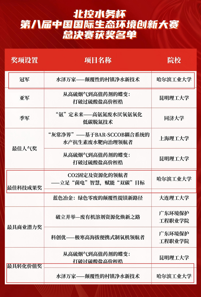 2025年11月22日,北控水务杯第八届中国国际生态环境创新总决赛在云南昆明圆满收官。哈尔滨工业大学环境学院获得创新引领组织奖,环境学院“水泽万家——颠覆性的村镇净水新技术”项目荣获冠军、最具转化价值奖,“CO2固定及资源化的领航者——立足‘菌电’智慧,赋能‘双碳’目标”项目斩获最佳科技成果奖。唐小斌、孙志强老师获优秀指导教师奖。